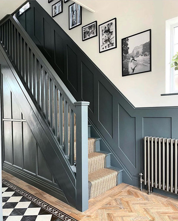 An interesting way to add more art to your hallway is to use patterned grey tiles on the steps. This idea is perfect for older houses full of character and an interesting alternative to patterned floor tiles. Using either real tiles or vinyl, place the pattern on the rise of the steps for maximum effect. Pick out a shade of grey from your pattern to paint the tread of the steps to pull the scheme together.