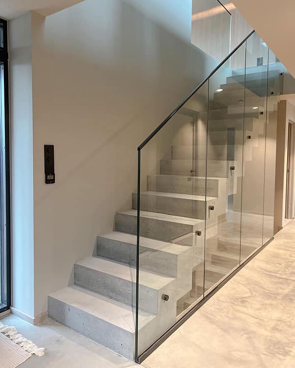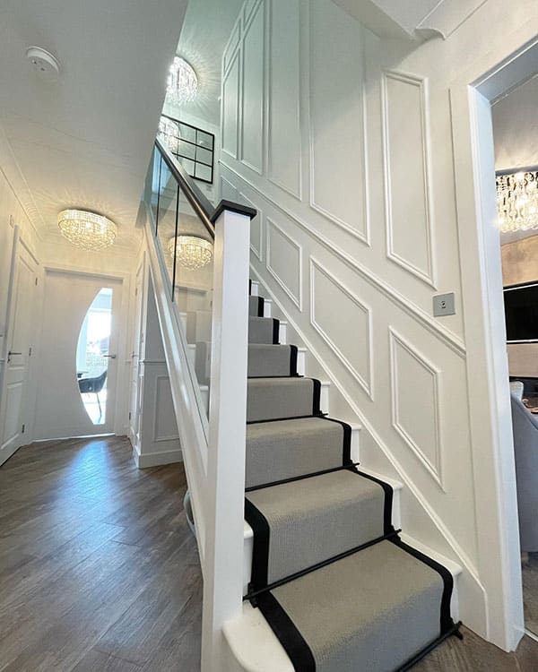 Rather than a chunky bannister, glass panes are an excellent way to create an elegant hallway. They work especially well with grey staircases to keep your hallway light and bright. Light grey walls and plush carpets work perfectly with this luxurious design.