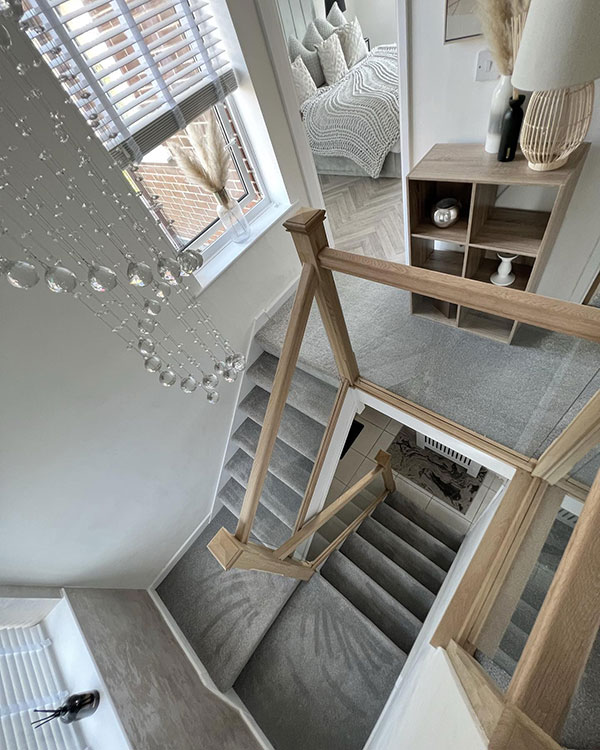 A grey staircase is a perfect opportunity to add a statement pendant light or chandelier to your home. Glass or chrome light fixtures will always look classy and compliment a grey colour scheme. Add a long, spiralling pendant to draw the eye up and break up the dead space.