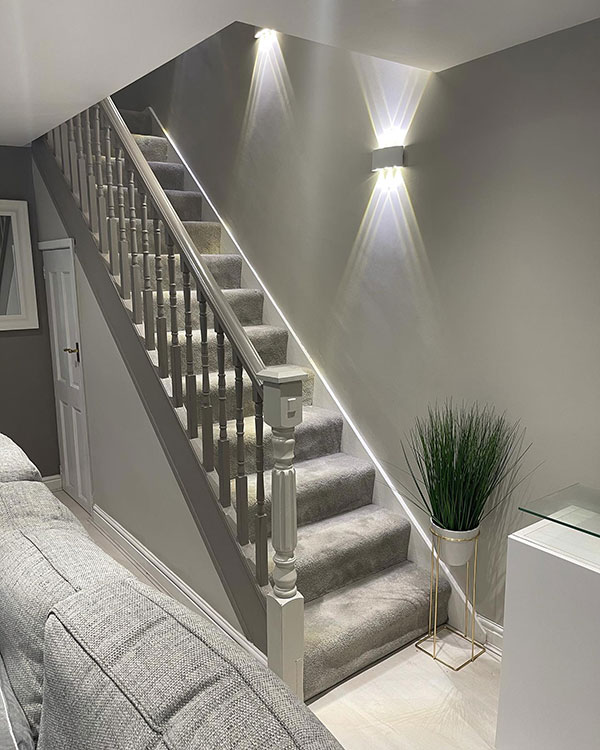 Up and down lights are both a functional and elegant addition to any grey staircase. A grey staircase can look dark in the evening so adding wall lights will keep your hallway bright and cosy. Up and down lights work especially well to break up a plain grey wall.