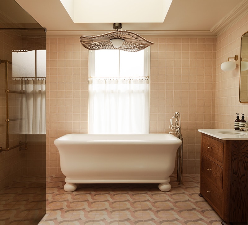 The central bathroom offers a playful shift in tone. Wrapped in bold encaustic tiles inspired by South American stencils, the space feels vibrant and tactile. “It’s a really fun explosion of joy and colour,” Janaye says.