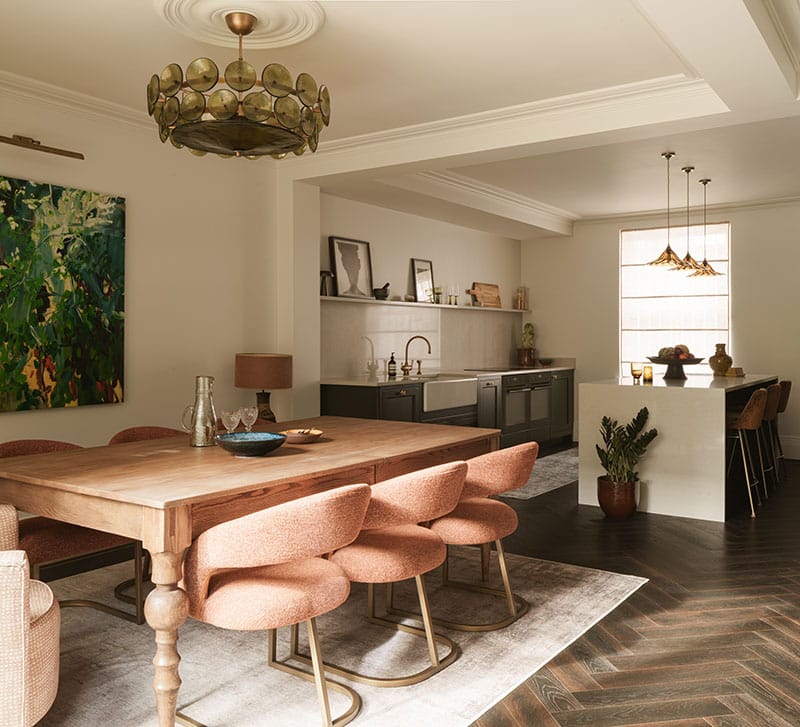 The dining area complements the kitchen with bespoke, comfortable seating and a large table, creating a space that’s both practical and welcoming for everyday life and entertaining.