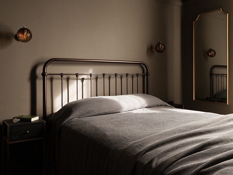 At the top floor of the house, the primary bedroom offers a moment of calm clarity - the space feels light and softened at the edges. It maintains a connection to the rest of the home through dark timber flooring and brass inlays but introduces muted textures and sculptural lighting to create a more serene atmosphere.