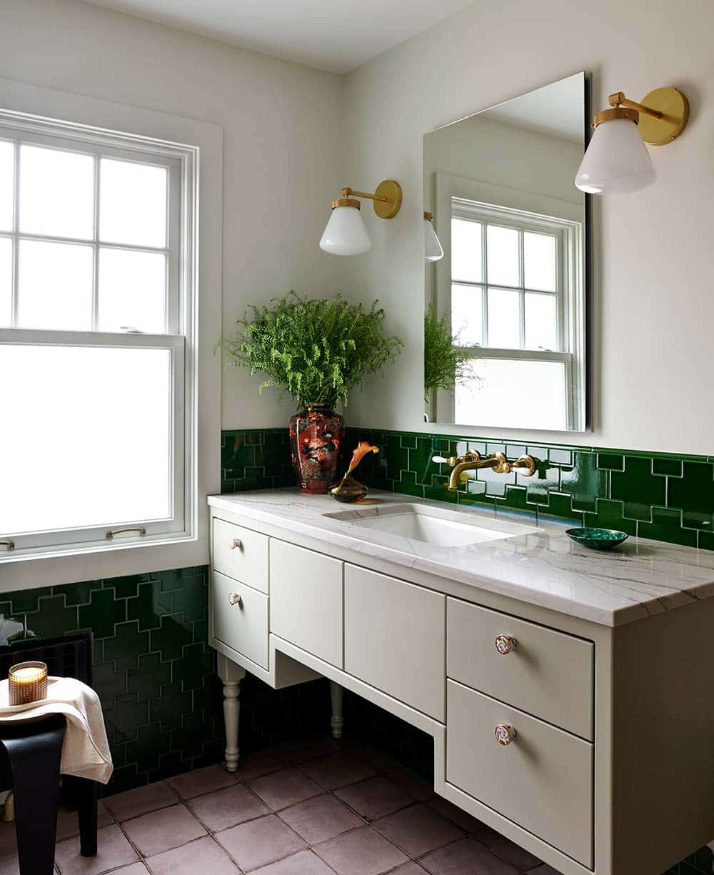 Even the bathroom became part of this dialogue. Glossy green tile and brass fixtures elevate a functional space into something memorable. It’s a reminder that small rooms don’t have to play small. One daring choice, whether a tile color, a mirror shape, or a hardware finish, can turn utility into delight.