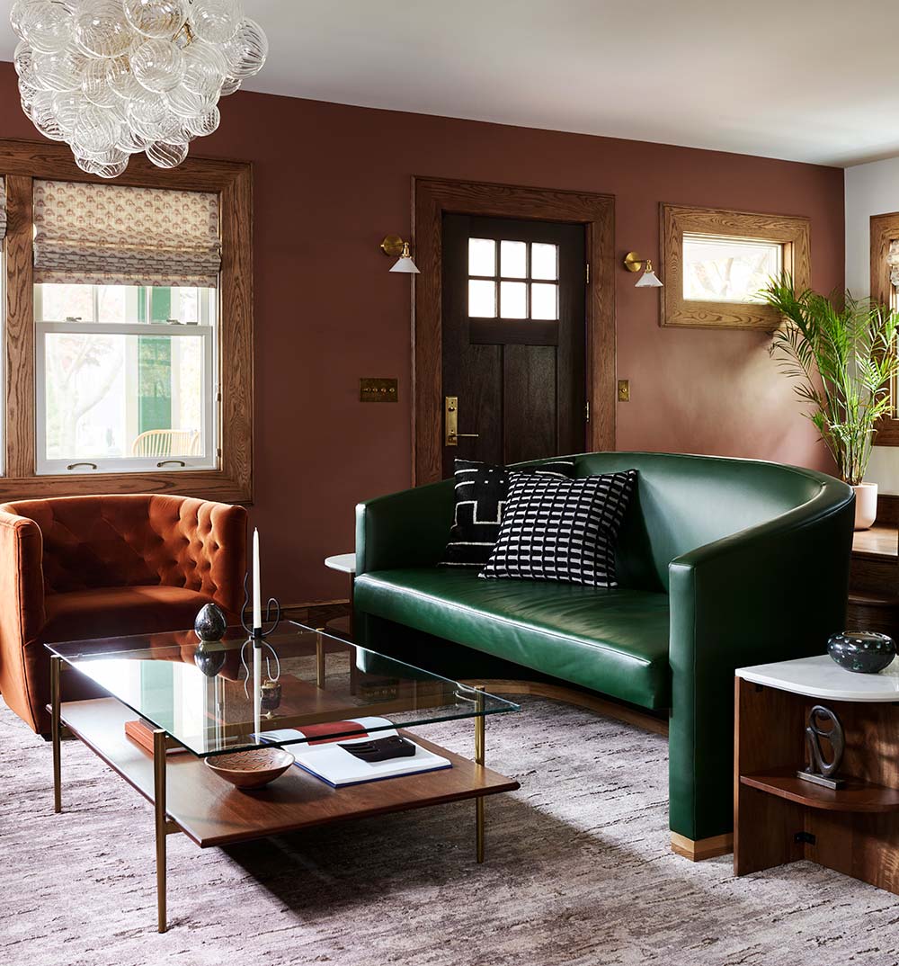 That same intentionality carried into the living room. A sculptural green sofa sits across from a rust velvet chair, two strong statements that find harmony rather than competing for attention. What makes it work is the echo: tone and scale speaking to each other so contrast feels balanced, not chaotic.